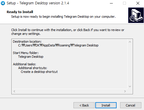 내용이 맞는지 한 번 확인을 한 다음에 Install 버튼을 클릭하면 드디어 컴퓨터에 텔레그램 PC 버전 설치합니다.