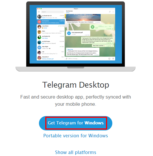 Get Telegram version for Windows 버튼을 클릭하게 되면 텔레그램을 PC에 설치할 수 있는 설치 파일을 컴퓨터 또는 노트북에 다운로드할 수 있습니다.